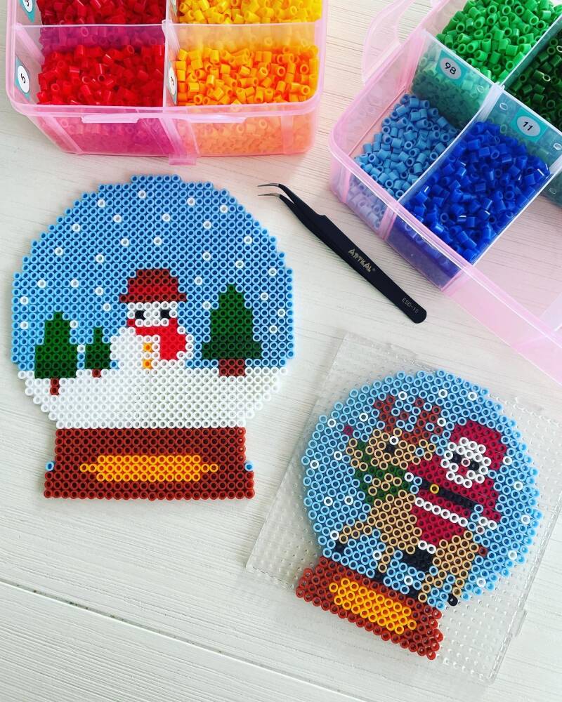 Uiteraard maakte ik voor de kerst wat leuke kerstversieringen van strijkkralen. Onlangs maakte ik deze sneeuwbol. Een grote met een schattig sneeuwpopje er in en een kleine met de kerstman.